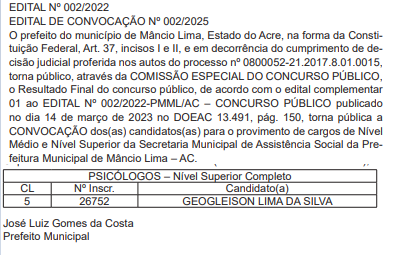 Além da exoneração e nomeação acima, o prefeito Zé Luiz também convocou um psicólogo que deverá integrar o quadro de servidores da secretaria de Assistência Social do município. O convocado foi aprovado no último concurso público, realizado na gestão do ex-prefeito Isaac Lima.