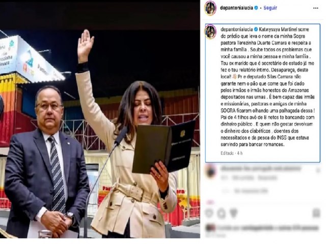 A deputada federal pelo Acre, Antônia Lúcia (Republicanos), voltou a criticar publicamente o marido, o também deputado federal e pastor Silas Câmara (Republicanos/AM), em suas redes sociais nesta quarta-feira, 3. Na nova publicação, ela direciona ataques à vereadora Katwyssya Martinel, de Rio Preto da Eva (AM).