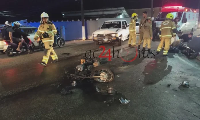 Um acidente envolvendo uma caminhonete e uma motocicleta deixou Shayd Ramon Lima de Souza, de 24 anos, ferido e resultou no incêndio de sua moto na noite deste sábado, 6, na Rua Isaura Parente, no bairro Estação Experimental, em Rio Branco.