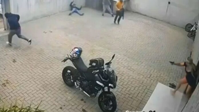 Imagens de câmeras de segurança mostram o momento em que o morador entra na garagem com uma motocicleta. Em seguida, ele é rendido pelos criminosos e colocado no chão, enquanto um dos suspeitos tenta acessar o interior do imóvel