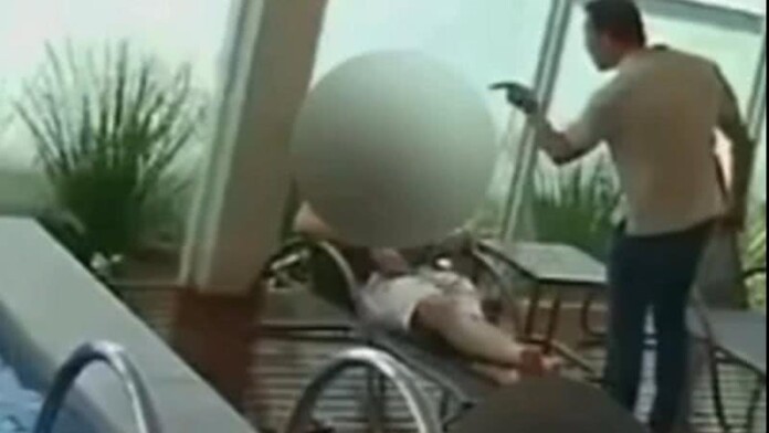 O advogado Rodolfo Ramos Caiado é visto em pé discutindo com o médico, que estava sentado em uma cadeira. O advogado então acerta uma sequência de socos no rosto da vítima; a briga ocorreu próximo a crianças que estavam na área da piscina.