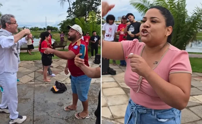 A intervenção gerou reação imediata de parte dos manifestantes. O marido de Eduvi, Juan González, se envolveu em um bate-boca acalorado com o professor Hildo Montezuma, do Centro Brasileiro de Solidariedade aos Povos e Luta Pela Paz, uma das lideranças presentes no ato. “Eu sou venezuelano, ninguém aqui é venezuelano, vocês têm que respeitar a Venezuela”, disse Juan durante a discussão. Em resposta, o professor retrucou: “Vai pros Estados Unidos”.