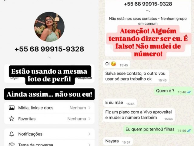“Atenção: Alguém tentando dizer ser eu. É falso. Não mudei meu número”, enfatizou na mensagem. “Estão usando a mesma foto que o meu. Mesmo assim, não sou eu”.