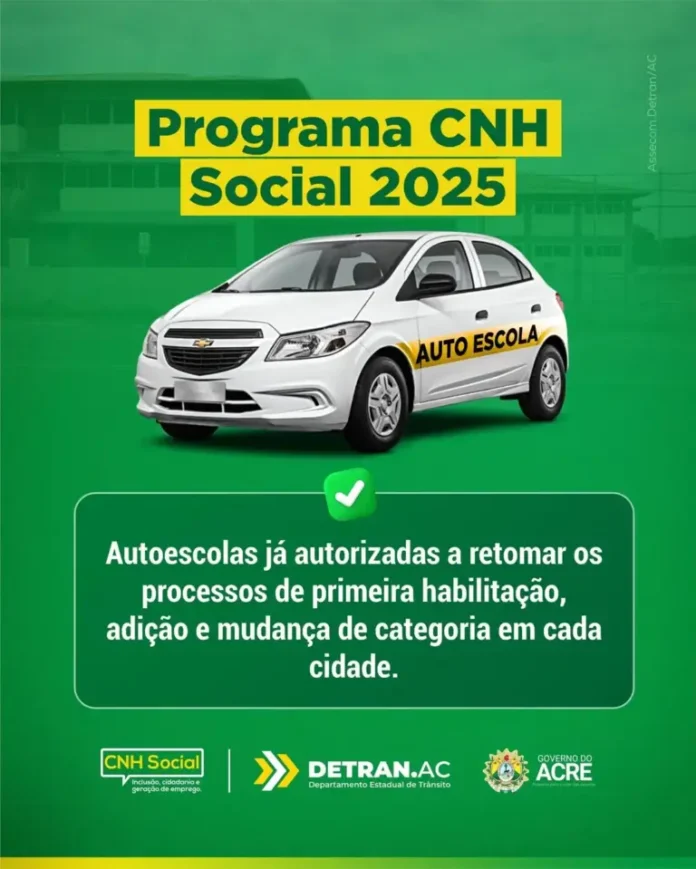 Os candidatos contemplados pelo CNH Social 2025 já podem voltar às aulas teóricas e práticas nas autoescolas credenciadas. A liberação foi anunciada pelo Departamento Estadual de Trânsito (Detran-AC) nesta quinta-feira (19) e vale para processos de primeira habilitação, adição e mudança de categoria em todo o estado.