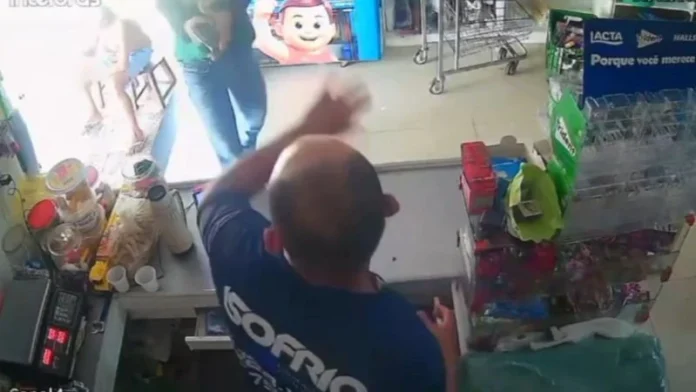 A ação foi registrada por uma câmera de segurança. Nas imagens, é possível ver o momento em que o suspeito chega ao local em uma motocicleta e entra no comércio usando capacete. Ao se aproximar do proprietário, ele saca uma arma que estava na cintura.