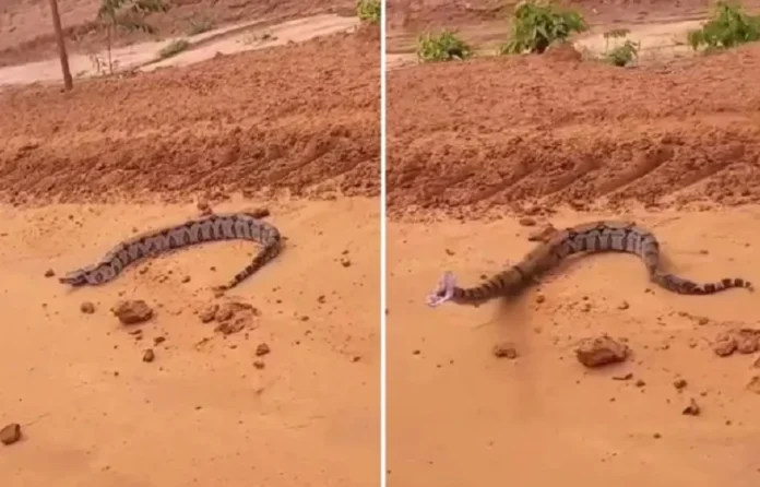 No vídeo, feito pela técnica em Agropecuária Suellen Layza de Mattos Moreira, a jiboia aparece nas margens de uma estrada rural antes de dar o bote contra a janela do carro.
