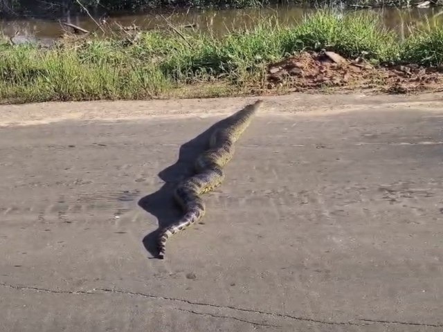 O animal, com alguns metros de comprimento, ocupava boa parte da via e chegou a chamar a atenção de quem passava pelo local. O flagrante foi registrado em vídeo.