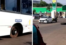 Pneu de ônibus solta e acaba acertando veículo no Acre