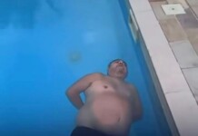 Homem viraliza ao dormir boiando em piscina enquanto esposa registra cena inusitada