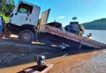 Caminhão escorrega em rampa e cai dentro do Rio Juruá