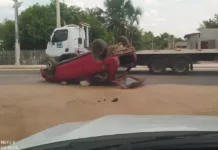 Em Mâncio Lima, carro cai de cima de guincho e deixa veículo destruído
