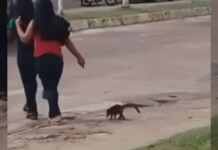 Populares registraram através de seus celulares uma mulher caminhando pelas ruas do centro de Cruzeiro do Sul com um animal silvestre na coleira.