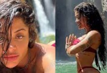 Curtindo a cachoeira, Aline Campos se equilibra na pedra e vira o bumbum para...
